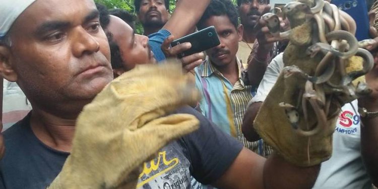 Monday morning, when Jena went back to his house he spotted another cobra near the door. He threatened the snake, which entered a basket kept in the yard. When he lifted the basket, Jena was astonished to see more than 11 snakes there. He immediately informed Sheikh Mirza, a renowned snake catcher who had caught the cobras and their hatchling from Bijay’s house a day back.