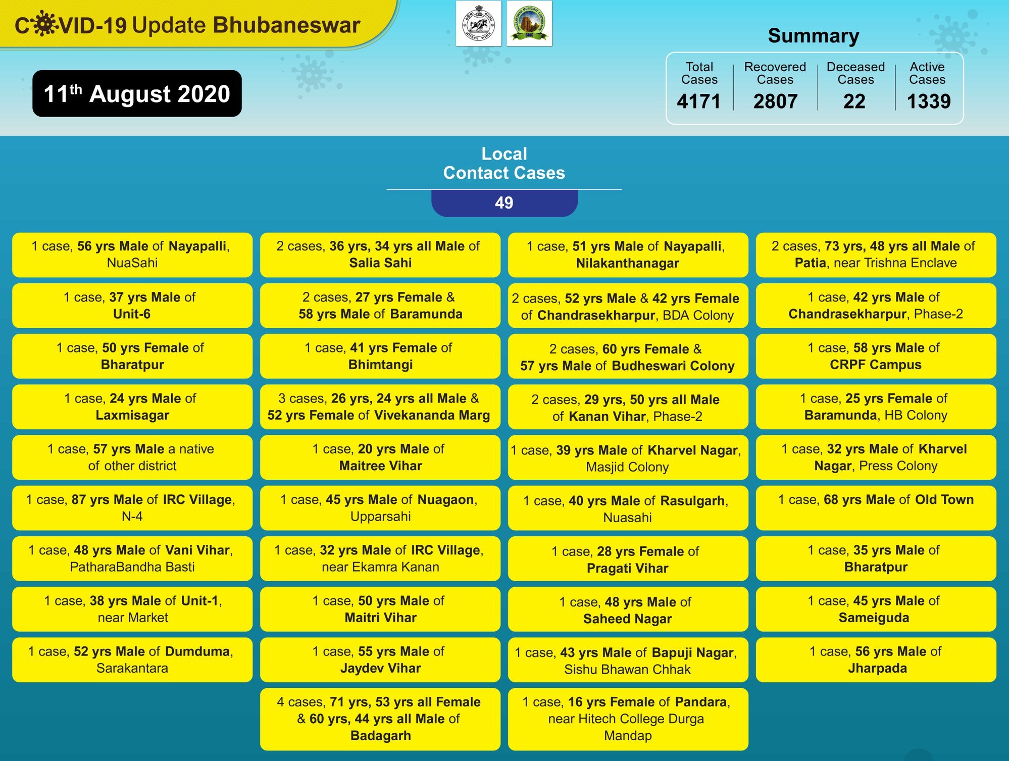 According to a notification issued by the civic body, as of Tuesday, 4,171 persons have tested positive for COVID-19 in Bhubaneswar out of which 2,807 have recovered. While there are 1,339 active cases, 22 persons succumbed to the disease.