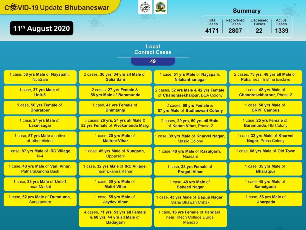 Primary contacts & nearby houses are being quarantined, sanitised & will be under active surveillance. pic.twitter.com/LRnrxAKCCF— BMC (@bmcbbsr) August 11, 2020