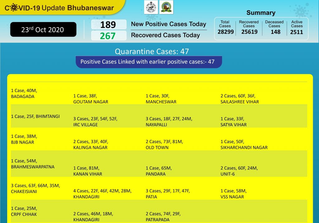 24 hrs under the BMC area on 23rd Oct 2020(till 9am). pic.twitter.com/KNv8GrmQ6F— BMC (@bmcbbsr) October 23, 2020