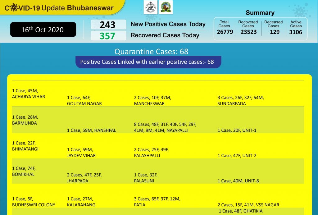 Bhubaneswar: As many as 243 new COVID-19 cases were detected under Bhubaneswar Municipal Corporation (BMC) limits in last 24 hours, BMC said Friday.