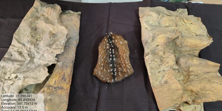 Keonjhar: Forest department personnel seized three deer hides and arrested one person in this connection from Kadbahali village in the Ghatagaon area of Keonjhar district Friday. The arrested accused was identified as Yadumani Naik. He is reportedly a hunter who killed deer and stored their skins for sale.