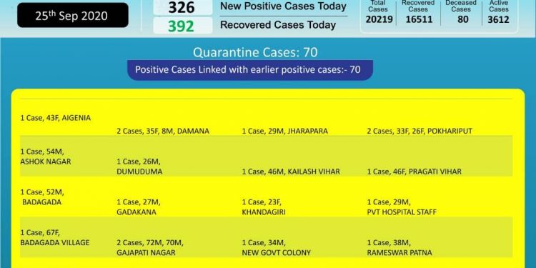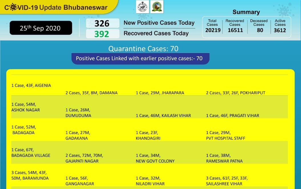Primary contacts & nearby houses are being quarantined, sanitized & will be under active surveillance. pic.twitter.com/qNV3e8rC1Y— BMC (@bmcbbsr) September 25, 2020
