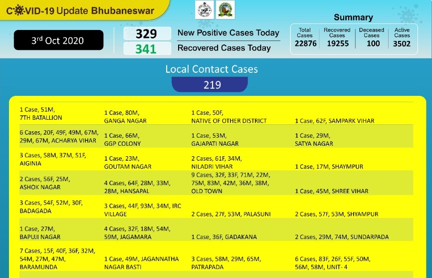 Primary contacts & nearby houses are being quarantined, sanitized & will be under active surveillance. pic.twitter.com/fdHmvVFaYS— BMC (@bmcbbsr) October 3, 2020