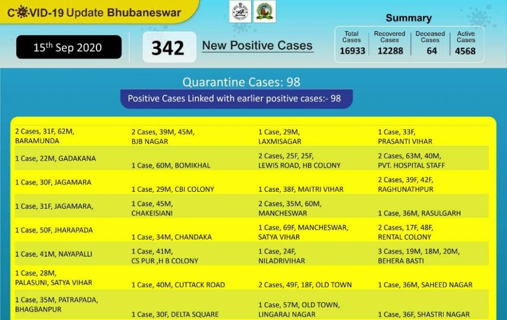 Primary contacts & nearby houses are being quarantined, sanitized & will be under active surveillance. pic.twitter.com/SGhRZtsNt2— BMC (@bmcbbsr) September 15, 2020