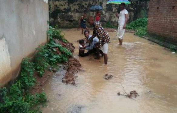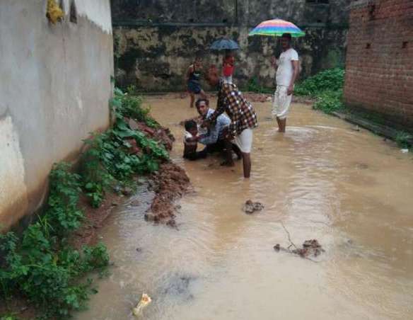 The PHD department of NAC had dug up drains in the locality for laying pipe lines. Due to incessant rain, water flowed on the road at ward no-14, making it impossible to differentiate between the road and the drain. Rahul accidentally slipped into the drain.