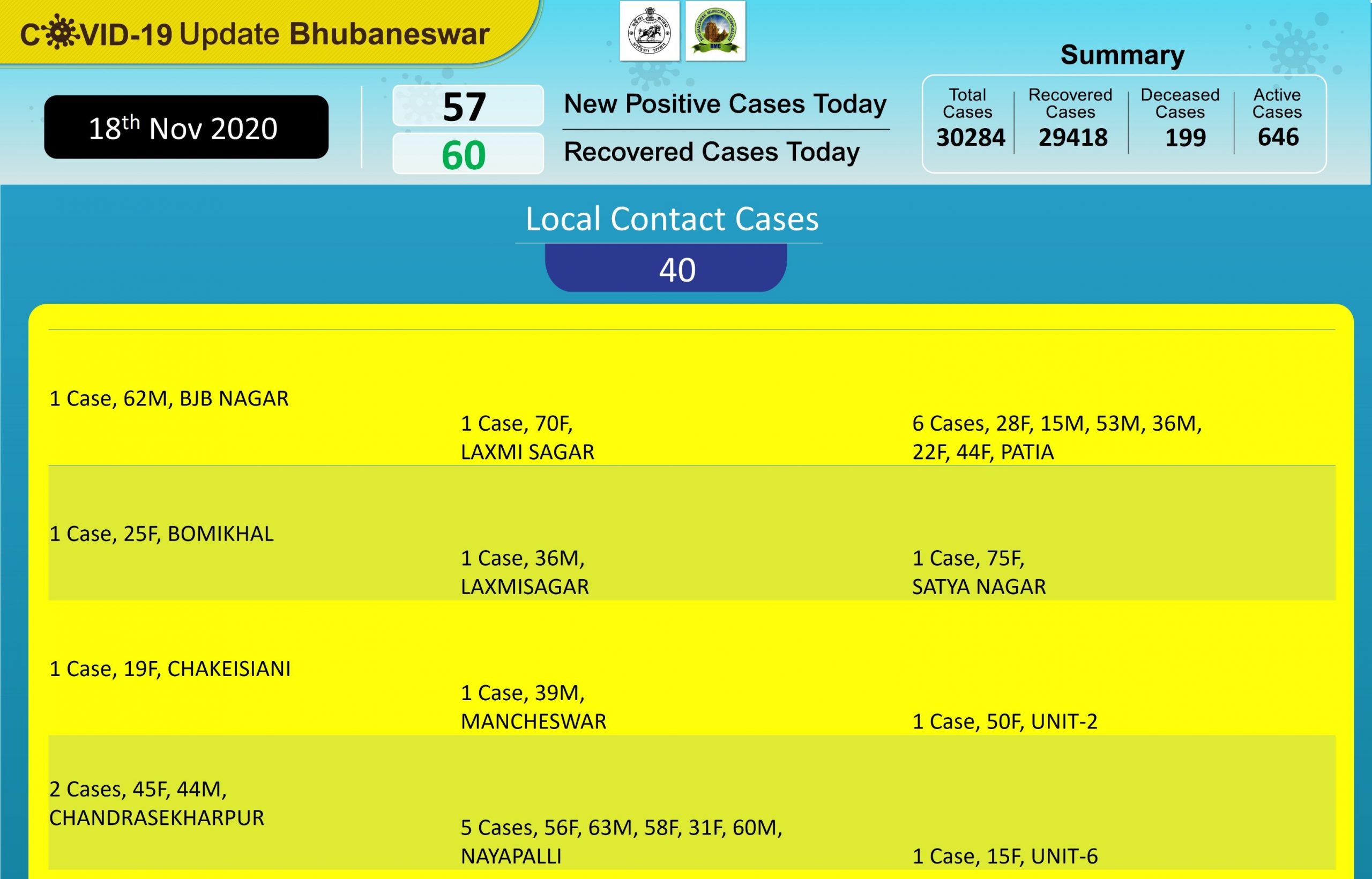 Bhubaneswar: As many as 57 new COVID-19 cases were detected under Bhubaneswar Municipal Corporation (BMC) limits in last 24 hours, BMC said Wednesday.