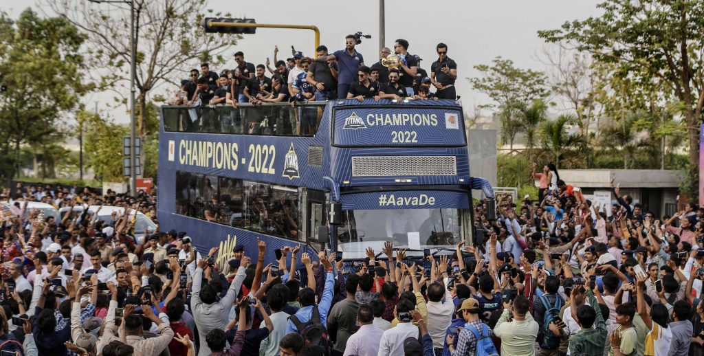 Ahmedabad: Thousands of fans flooded Monday the city’s streets as Gujarat Titans took out a victory parade on an open-top bus. They did so to celebrate their title triumph in a memorable maiden season in the IPL. On the same day, Gujarat Chief Minister Bhupendrabhai Patel hosted the state’s newly-crowned Indian Premier League (IPL) champions and felicitated them.