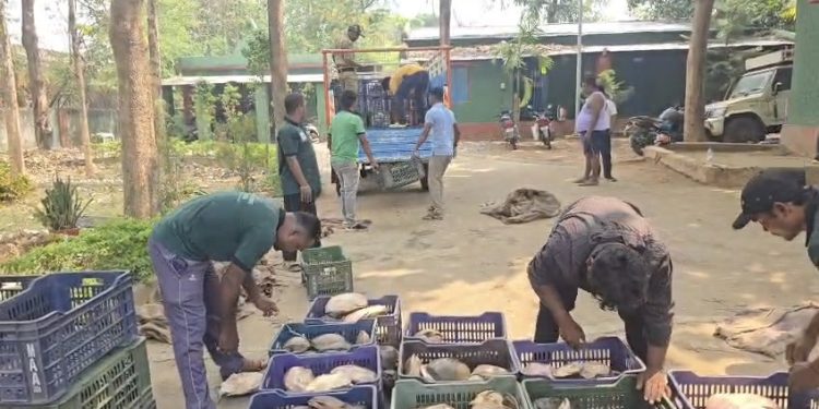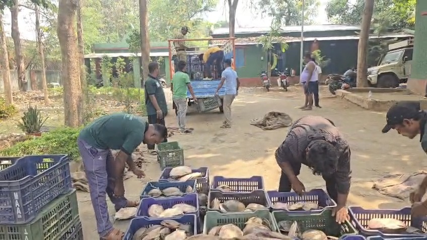 Kalimela: Forest department officials seized a massive consignment of tortoises at the Motu border checkpost in Malkangiri district Wednesday. A total of 761 tortoises, weighing approximately 2.3 tonnes (2,305 kg), were confiscated. Authorities estimate the market value of the haul to be around Rs 7 lakh. According to officials, the tortoises were being transported from Andhra Pradesh into Odisha in a Bolero vehicle. Upon suspicion, forest staff stopped and inspected the vehicle, uncovering the illicit cargo. The driver and the vehicle were taken into custody.