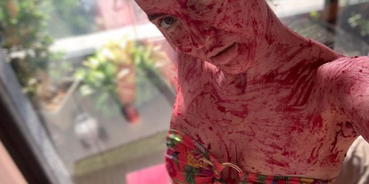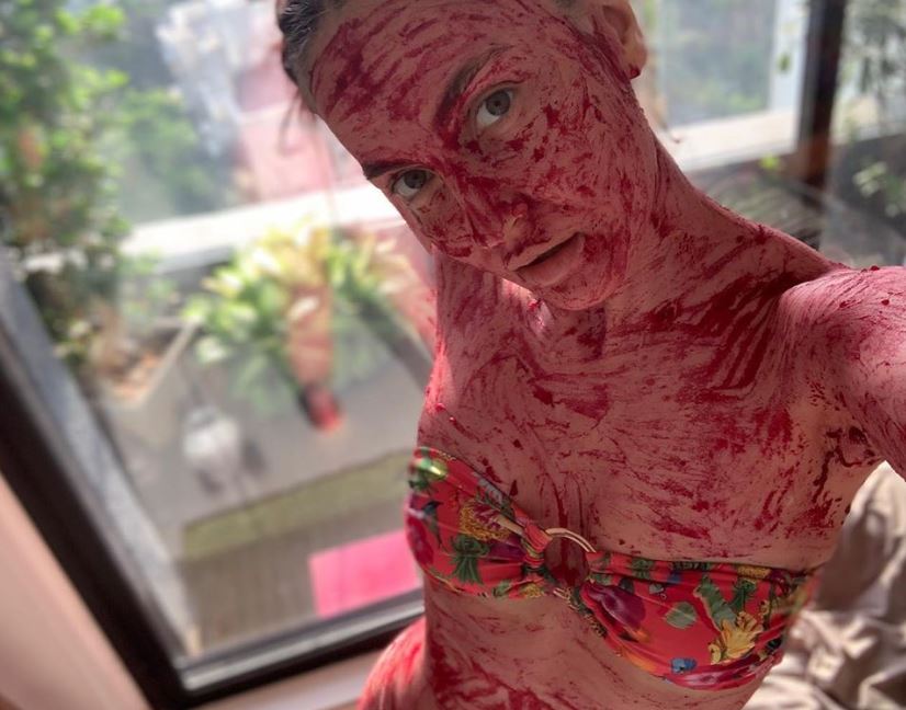 The actress took to Instagram Saturday and shared a few photos where she has a beetroot pack applied all over her body.