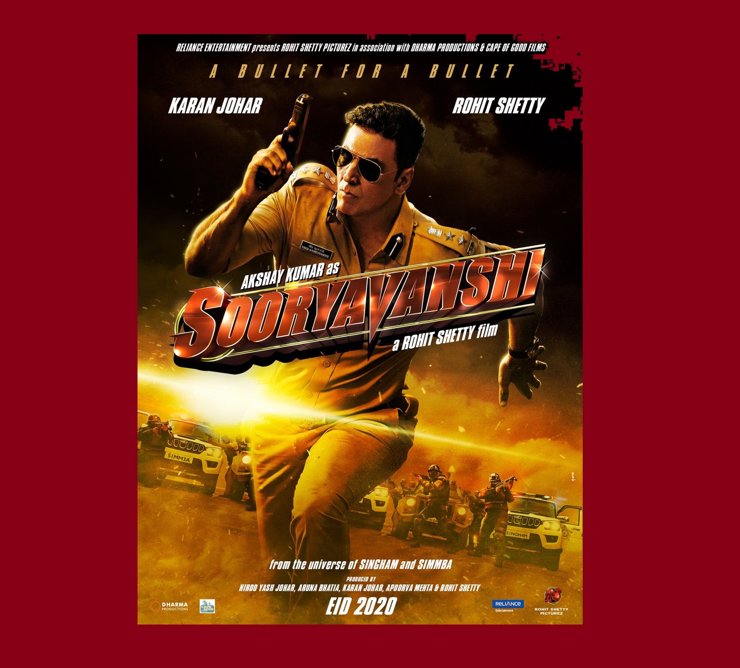 A bullet for a bullet! Get ready for #RohitShetty’s #Sooryavanshi 🔥 on Eid 2020. Action-packed, masala intact! @karanjohar @RelianceEnt @RSPicturez @DharmaMovies #CapeOfGoodFilms pic.twitter.com/wM2G3Vx1IO
