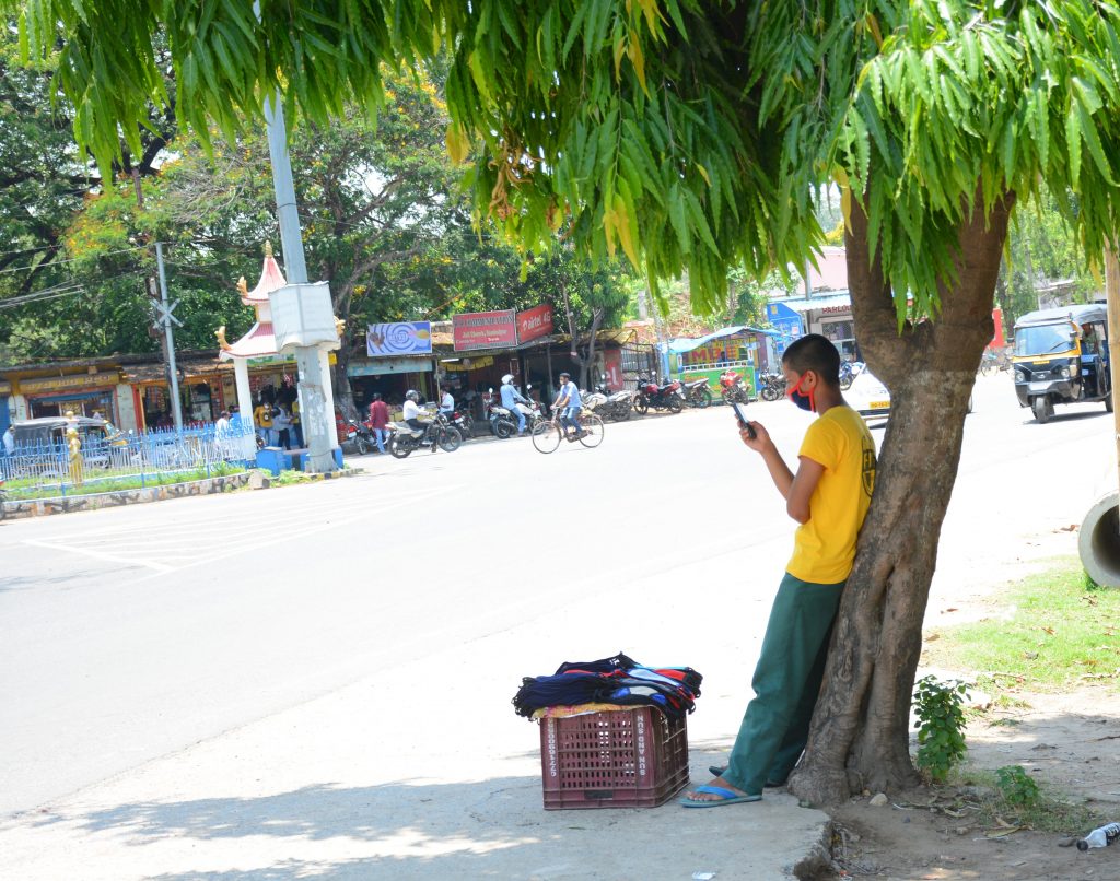 With hardly any customer around, a youth selling masks under a tree on roadside in Sambalpur, plays with his smartphone
