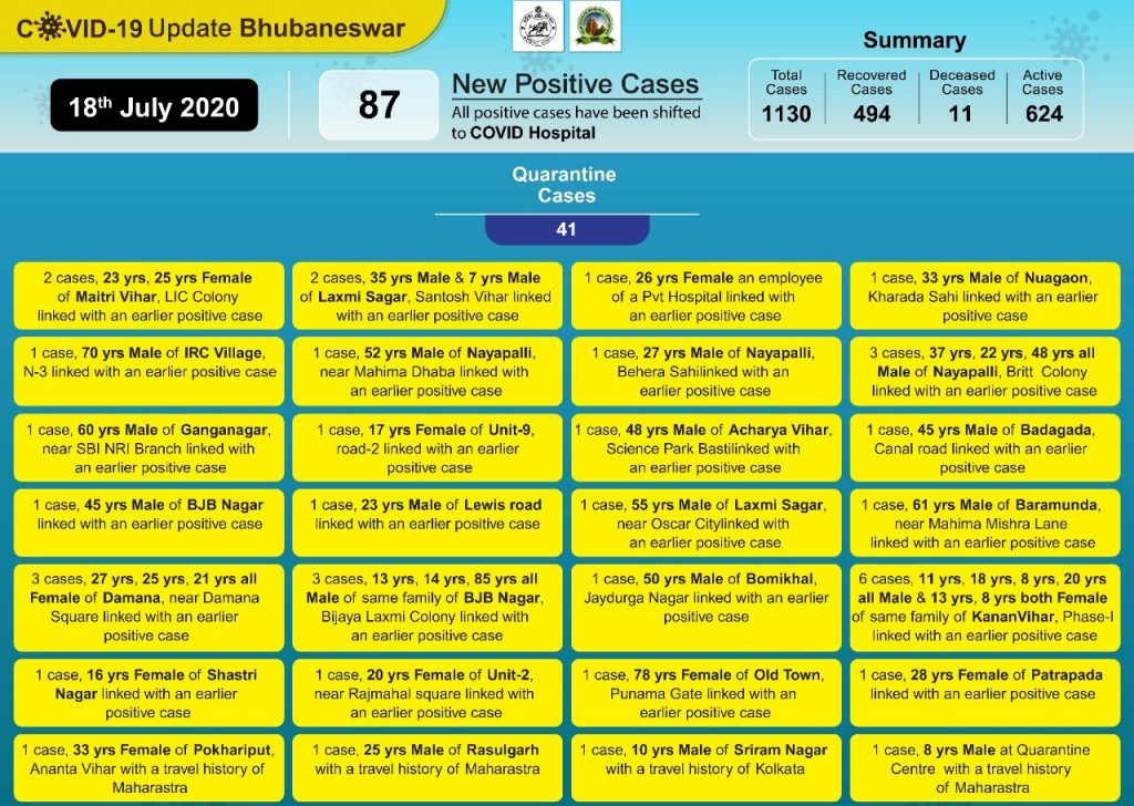 According to a notification issued by the civic body, as of Saturday morning, 1,130 persons have tested positive for COVID-19 in Bhubaneswar out of which 494 have recovered. While there are 624 active cases, 11 persons succumbed to the disease.