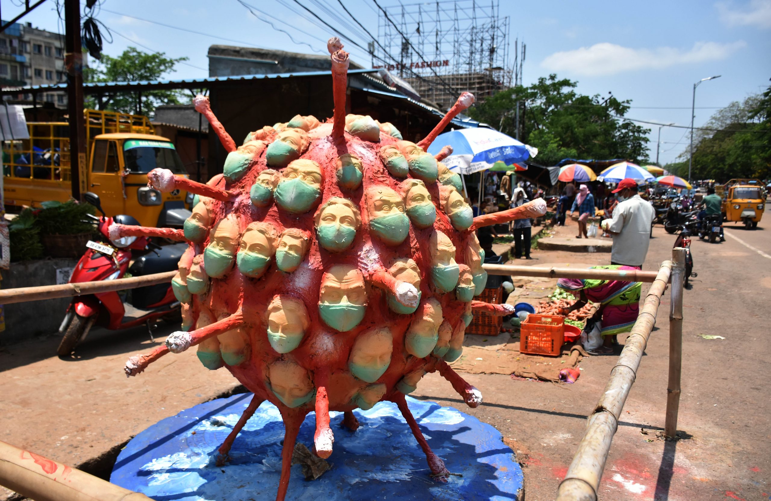 Created by Odisha Progressive Artists’ Group, an artwork spreads awareness on the importance of wearing masks amidst novel coronavirus pandemic at Damana market in Bhubaneswar, Thursday
