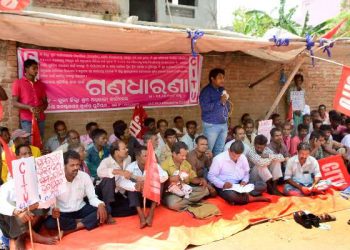 Puri: Hundreds of labourers under the banner of Odisha Construction Workers' Union, Puri branch, staged a mass agitation in front...