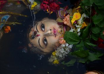 Clay idols of Goddess Durga being immersed in an artificial tank on Kuakhai riverbed in Bhubaneswar Long queue of...