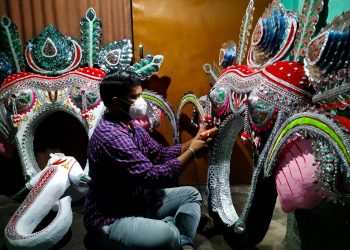 An artisan prepares elephant mask for Lord Jagannath at Phirangi Bazaar area in Cuttack ahead of Snana Purnima ...