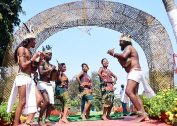 Artistes perform at the second day of the ongoing international exhibition on folk and tribal art at State Museum in...