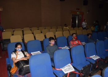 A man screens temperature of a movie-goer at Keshari Talkies in Bhubaneswar as theatres reopened Class-X students of Capital...