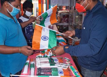 Ahead of the Republic Day, a small time seller sells Tricolours to customers in his stall at Choudhury Bazar in...