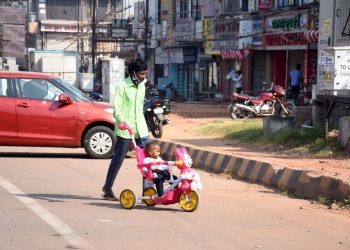 A man takes his kid on a baby-stroller under the scorching heat Merchandise for Christmas in full display at Rajmahal...