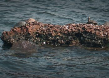 A group of turtles rest atop a rock in the Mahanadi river stream near Jobra Exhibition ground gearing up...