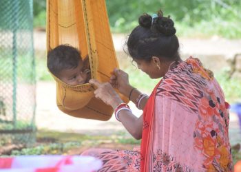 A woman street vendor plays with her child on Rajbhaban Road in Bhubaneswar Kamala avatar of Goddess Basanti...