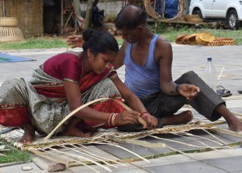 A couple engaged in the making of bambooware near Rajmahal Square, Bhubaneswar Exhibition Ground in Bhubaneswar wears a deserted look...
