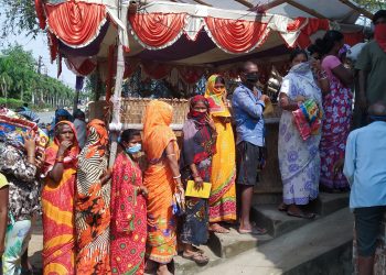 Flouting the social distancing norms, people queuing up to collect PDS goods in Purighat area of Cuttack, Saturday
