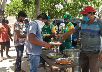 People collecting food from an Aahaar centre at Sishu Bhawan in Cuttack in the wake of lockdown, Saturday