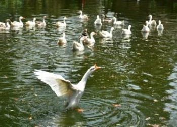 Swans frolic in a pond in Old Town area in Bhubaneswar, Monday as the temperature has started rising