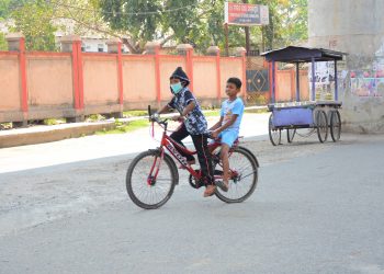With the 21 lockdown in force, a boy carries his friend on his bicycle on a deserted street in Sambalpur.