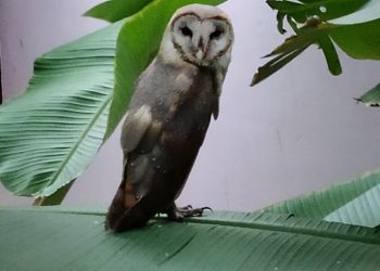 A white owl perches on a banana plant in Shakti Nagar area of Cuttack, Friday