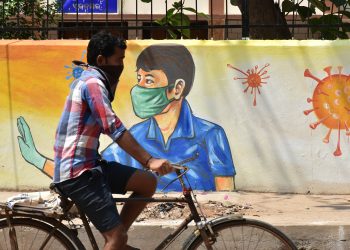 A cyclist pedals past graffiti depicting precautionary measures against coronavirus near Unit-I market in Capital, Friday