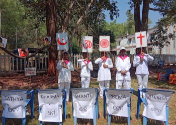 Kids hold placards on spiritual and value-based education at a programme organised by Sri Satya Sai Bal Vikash at Damanjodi...