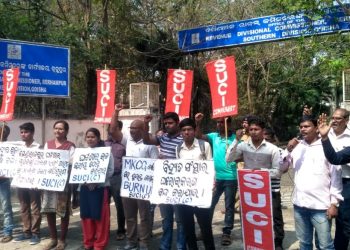 SUCI activists staging a demonstration outside the RDC office in Berhampur Monday, demanding withdrawal of privatisation of discoms; Rs 10...
