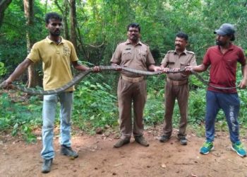 Angul: A 14 feet long king cobra was rescued from a house at Talagada village under Bantala police limits in...