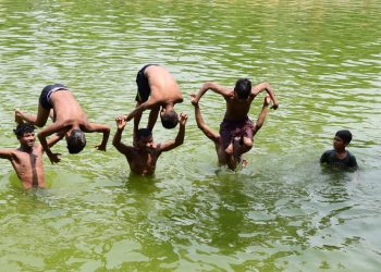 To beat the blistering heat Monday, kids perform aerobics in a pond at Baramunda Fishermen out for their daily catch...