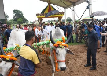CM Naveen Patnaik performs ‘Akhi Muthi Anukula’ at Odisha University of Agriculture and Technology (OUAT) campus in Bhubaneswar Members...