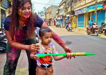Young ladies colour each other in Cuttack's Alisha Bazar area Jharapada Special Jail inmates' children celebrate Holi in Bhubaneswar...