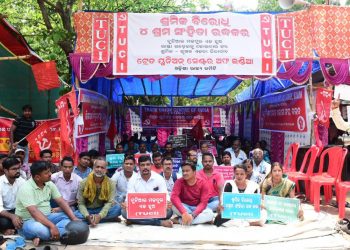 Members of Odisha unit Trade Union Centre of India (TUCI) stage demonstration at PMG Square in Bhubaneswar