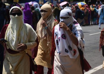 Women hold umbrellas, wear scarfs as face masks to get relief from scorching sun in Bhubaneswar