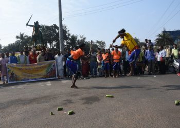 Members of Odisha Paika Akhada showcase martial art at Kalpana Museum Square in Bhubaneswar on death anniversary of Bakshi Jagabandhu...