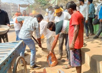Members of Subhash Sangathan march towards CMC office carrying sand to protest against poor condition of Cuttack roads
