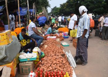Street vendors sell clay lamps, flowers and decorative lights at Unit-1 market in Bhubaneswar ahead of Deepavali Top police officers...