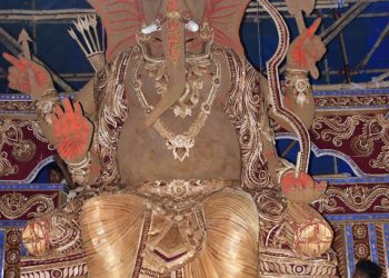 Artists give final touches to idols of Lord Ganesha made up of sand ahead of the Ganesh Chaturthi festival, at...