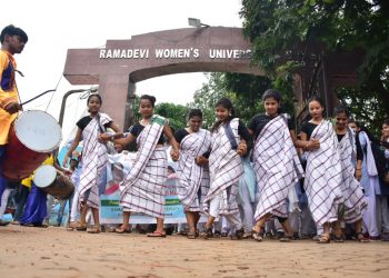 Students of Rama Devi Women's University in Bhubaneswar celebrate Droupadi Murmu’s election as President of India Students of BJEM school...