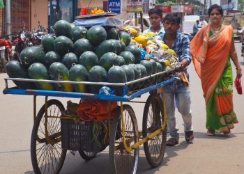A street vendor carries watermelons on a pushcart in Cuttack A group of women unload coconuts from a truck at...