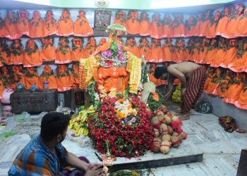 Devotees throng Hanuman temple at Unit-I market in Bhubaneswar on Maha Bishuba Sankranti A volunteer of ‘Janamangala Parisada’ offers...