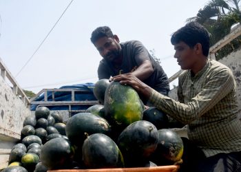 A man unloads watermelons from a truck in Ashok Nagar area of Bhubaneswar   Corporators congratulate Cuttack Municipal Corporation Deputy...